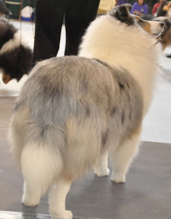 Vor nicht all zu langer Zeit wurde dieser weissgefleckte bluemerle Rüde (Bild oben) zum Champion gemacht, während der Zeit als Collie Langhaar Championship Shows im Durchschnitt bis zu 200 angemeldete Hunde zählten. Auch er wurde sehr oft als Deckrüde genutzt. So oft, dass er fast alle bluemerle Linien der heutigen Zeit beeinflusst. Schlussendlich hat auch dieses Jahr eine weissgefleckte Hündin (Bild unten) eine erfolgreiche Welpenkarriere mit einigen Res. CAC und einem Gewinn an der diesjährigen Championship Show von unserem Club CAC und BOB gemacht. Ich bin mir sicher, dass sie auch bald zur Zucht eingesetzt werden wird. Sie werden bemerkt haben, dass diese Hündin sowie auch der Rüde kein weiss an der Aussenseite des Schenkels tragen, aber trotzdem sind diese beiden Collies weissfaktoriert mit weissen Markierungen auf dem Rücken.