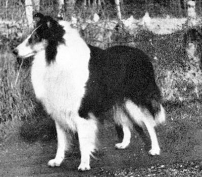 Weissfaktorierter tricolor Rüde Champion Beulah's Blanco-y-Negro bekam ein CAC an der ersten Championship Show des Londoner Collie Clubs 1955 unter dem Allrounder Herr J. Garrow